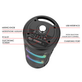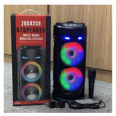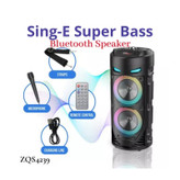 اسپیکر چمدانی بیسیم و قابل حمل مدل ZQS4239 همراه میکروفن وایرلس و ریموت کنترل است. بدنه محکم از مواد مرغوب ساخته شده است که مقاومت بالایی در برابر آسیبهایی نظیر ضربه و فشار از خود نشان میدهد این اسپیکر از کیفیت پخش صدای قدرتمندی برای جشنها و مهمانیها به خصوص در محیط باز و شلوغ برخوردار است. درایو قدرتمند 12 اینچی این پارت باکس با توان خروجی معادل 1800 وات همچنان دارای نور پردازی داخلی در هنگام پخش موسیقی است. نمایشگر LED و پنلی از دکمههای فیزیکی جهت مدیریت موسیقی ؛ تنظیم ولوم و نور بر روی بدنه تعبیه شده و یک ریموت کنترل نیز همراه آن قرار دارد تا از راه دور این تنظیمات نیز برای کاربر امکان پذیر باشد. شارژ مجدد باتری نیز به وسیله آداپتور مخصوص قابل انجام است.